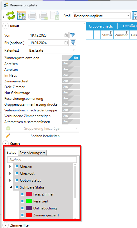 Unter Status kann man dann kontrollieren, ob alle benötigten Status der Buchungen ausgewählt wurden.
