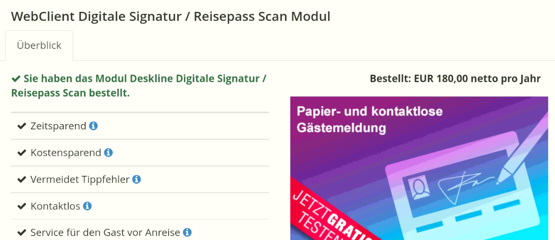 Wählen Sie im Hauptmenü „Zusatzmodule“ und „Digitale Signatur / Reisepass Scan“ aus. Wenn folgende Meldung erscheint, ist das Modul zwar bestellt worden, aber von Feratel noch nicht freigeschaltet: